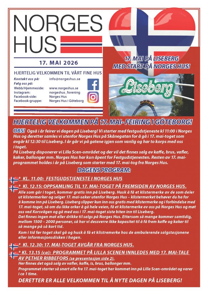 Kulturaktiviteter 17. mai feiring i Göteborg 2026-04-23 Louise Larsson louise@norgeshus.se Inläggsnavigering Vårdugnad Søndag 3. mai kl. 13.00