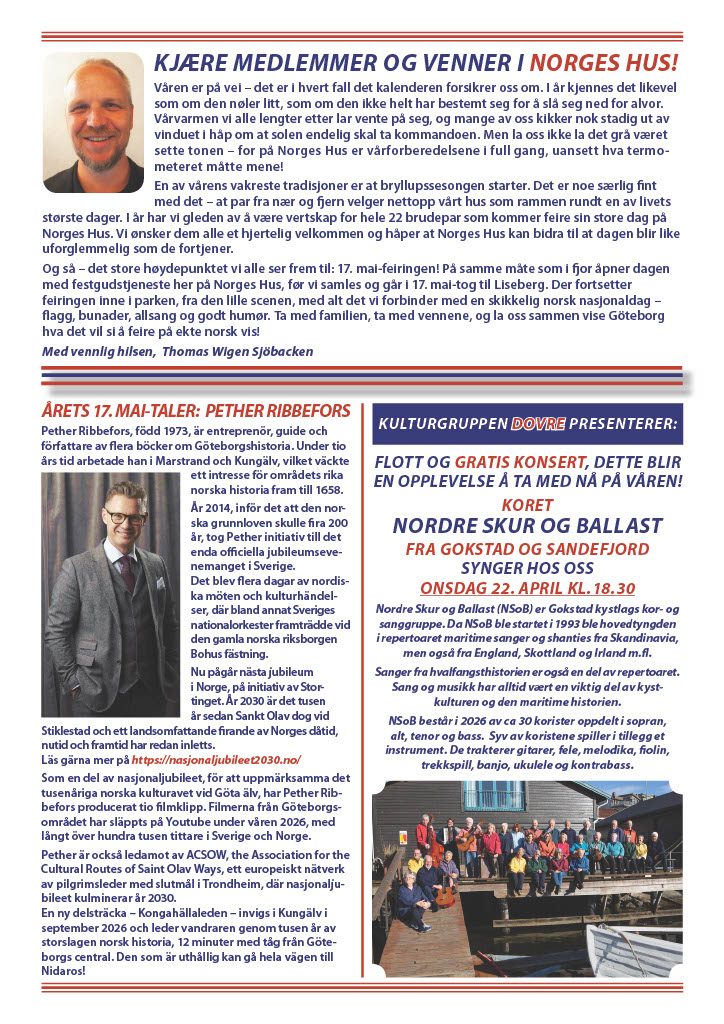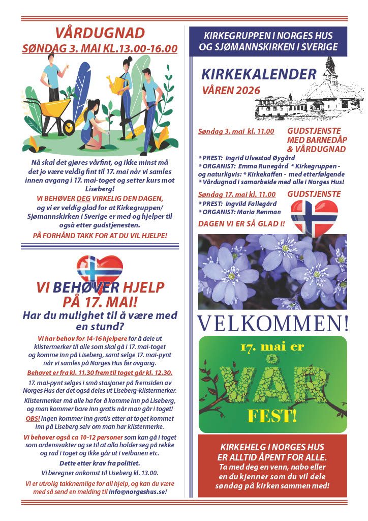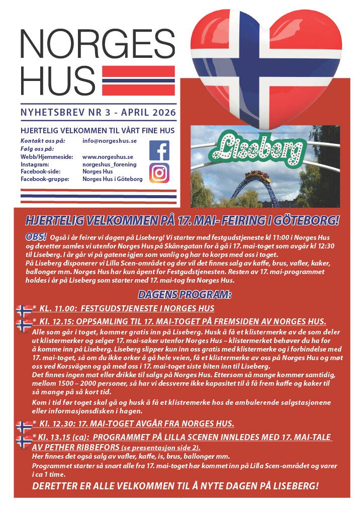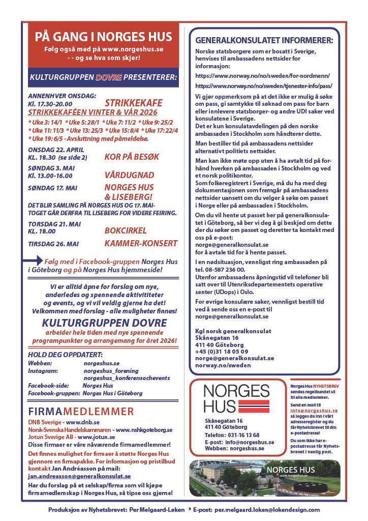 Kulturaktiviteter, Nyhetsbrev, Uncategorized Nyhetsbrev Nr. 3 April 2026-04-17 Louise Larsson louise@norgeshus.se Inläggsnavigering Familiegudstjeneste 3. mai