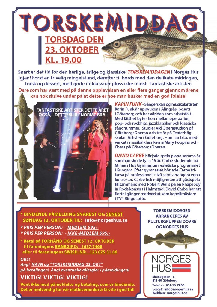 Kulturaktiviteter Torskemiddag 23. Oktober 2025-10-01 Louise Larsson louise@norgeshus.se Inläggsnavigering Familiegudstjeneste Söndag 5. oktober